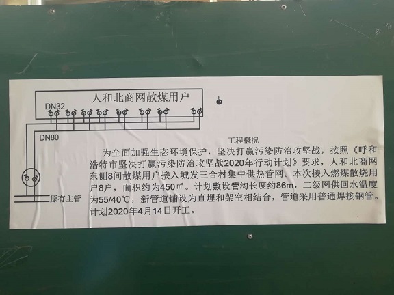按照《呼和浩特市堅(jiān)決打贏污染防治攻堅(jiān)戰(zhàn)2020年行動計(jì)劃》總體要求,該項(xiàng)目接入燃煤散燒用戶42戶,面積約2450平方米,其中一家村豐州路西34戶,2000平方米;人和北商網(wǎng)8戶,450平方米。該項(xiàng)目計(jì)劃敷設(shè)管線溝槽長度約174米,其中一家村豐州路西為88米,人和北商網(wǎng)為86米。新管道鋪設(shè)以直埋和架空相結(jié)合的方式,全部采用普通焊接鋼管,開工時間為2020年4月14日。