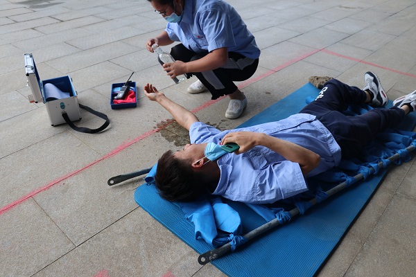 滅火組出動、疏散與警戒組出動、后勤通訊與救援組出動。參演人員一聲聲清晰宏亮的指令與報(bào)告從電話和對講機(jī)傳來,各應(yīng)急小組分頭行動完成工作之后,開始向指定位置集合,分別向現(xiàn)場指揮官趙建輝匯報(bào)工作完成情況。