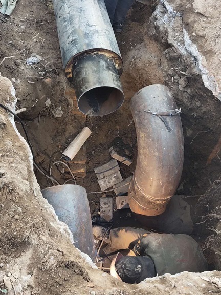 9月27日,展東路與海拉爾大街十字路口的一次網(wǎng)跑水,開挖后發(fā)現(xiàn)相鄰的排污管道有破損,供熱管道浸泡在污水中,腐蝕嚴(yán)重,需要先處理好污水管道才能搶修熱力管道,增大了施工難度。經(jīng)過幾次嘗試,最終決定對(duì)漏點(diǎn)處進(jìn)行線位改遷,重新鋪設(shè)管道。經(jīng)過10天持續(xù)不斷、緊張輪流作業(yè),于10月6日中午,終于修復(fù)管網(wǎng)漏點(diǎn),保證了管網(wǎng)注水試壓。