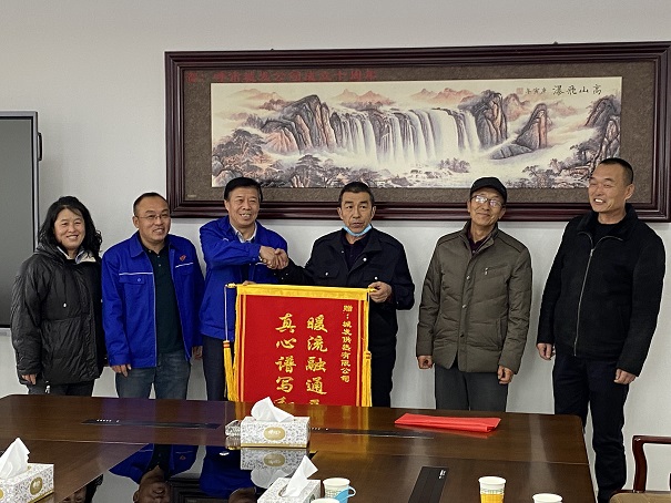 11月29日,西黑河村村長(zhǎng)胡滿貴一行四人來(lái)到市城市燃熱集團(tuán)公司將一面寫(xiě)著"暖流融通西黑河真心譜寫(xiě)和諧曲"的錦旗贈(zèng)送呼市城發(fā)供熱公司,對(duì)城發(fā)供熱公司用心盡力,精心施工,保障供暖,傾情服務(wù)表達(dá)了誠(chéng)摯的謝意!集團(tuán)公司總工程師胡月在鄭重地接過(guò)這份來(lái)自村民的認(rèn)可。