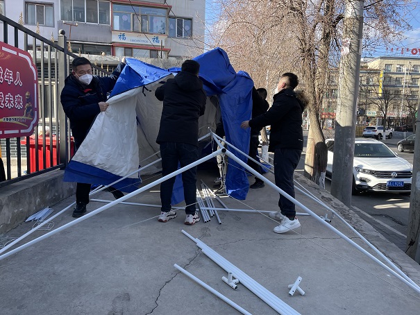 連日來,公司的近百名員工陸續(xù)被派往社區(qū)一線支援疫情防控工作,事務管理中心安排專人和他們保持聯(lián)系,及時把一次性醫(yī)用外科口罩、N95口罩、防護服、防護手套、隔離面罩等疫情防控物資送到各個值守點。2月28日,事務管理中心主任胡夢園、黨支部書記劉紅梅在電子路社區(qū)值守點查看時,發(fā)現(xiàn)當班的員工在寒風中堅守著,及時為他們搭建了帳篷,送來了電暖氣。