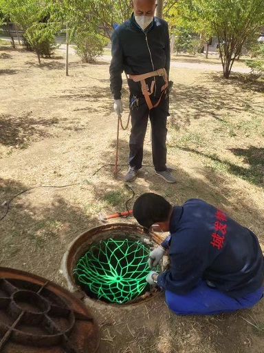 安裝現(xiàn)場,工作人員打開井蓋通風,在用氣體檢測儀檢測井內(nèi)的氣體符合作業(yè)條件后,工作人員綁好安全帶用電鉆在井壁上鉆孔,釘入尾端帶鉤的膨脹螺栓,擰緊固定后將防墜網(wǎng)掛到掛鉤上,一張防墜網(wǎng)就安裝完成。現(xiàn)場工程師傅每完成一個防墜網(wǎng)的安裝,在確保安全的情況下,都會親身踩試檢驗,確保安裝牢固。