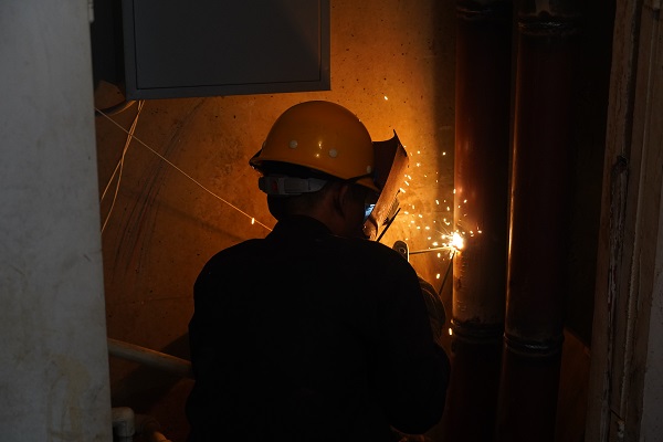 上午9:30時,直播組來到開天花園北區(qū)1號樓前,小區(qū)供熱主線的管溝內,一工人師傅穿著長褂,帶著手套在狹小的空間內正嫻熟地進行焊接,飛濺的火花下面,看不清楚他的臉,待焊接完一段后,他取下電焊面罩,露出一張黑紅黑紅的臉,汗水順著額頭直瀉而下,汗珠吧嗒吧嗒流在眼里、滴到了地上,不時用衣袖擦眼睛。他告訴筆者,地面溫度是36°,他焊接的周邊溫度要達到50多度。面對高溫的"烤"驗,他全然不顧,用他的話說:這是他們的工作常態(tài),早已習慣。