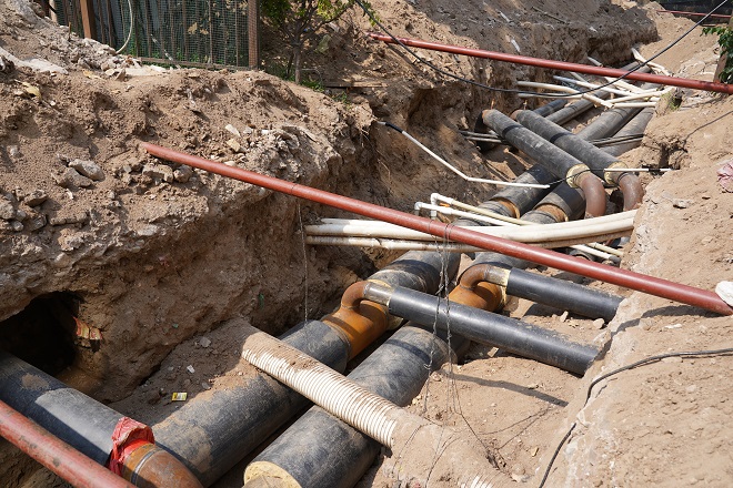 在開天花園小區(qū)熱力站供熱管線出口區(qū)域,兩名工人師傅正在清理現(xiàn)場的供熱管線?,F(xiàn)場看到管溝內鋪設的主管線、與樓宇的抽頭安裝已全部完工,溝內自來水管線、污水管線、弱電管線、強電管線縱橫交錯。