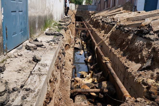 開天花園小區(qū)施工直播結束后,我們直播組直奔如意小區(qū)供熱二次管網改造的施工現(xiàn)場。循著一陣陣的臭味,我們來到了如意小區(qū)的A區(qū)一幼兒園后面,映入眼簾的是正在抽排污水的地溝,地溝中的供熱管線距污水水面非常近,污水在炎熱天氣的發(fā)酵下,臭氣熏天。工人們正在深溝里進行排污及淤泥清理工作,每一個動作都顯得格外艱難,衣服幾乎和污水一個顏色。