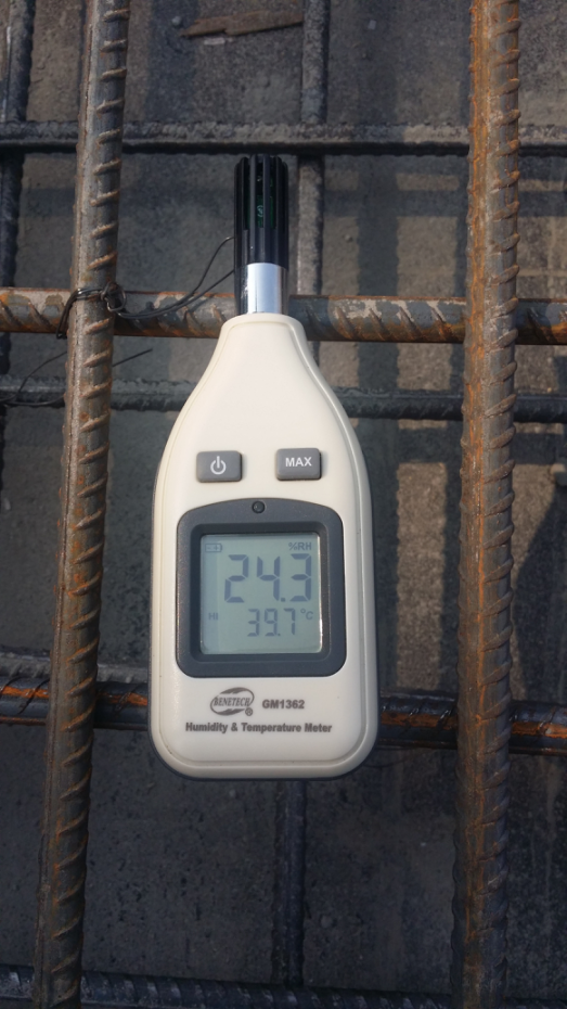 2017年7月18日上午10:30左右,呼和浩特市低碳供熱亞行貸款項目辛家營熱源廠中繼泵房蓄水池墻體和消防泵房梁柱開始澆筑,此時施工現(xiàn)場溫度為39.7℃。