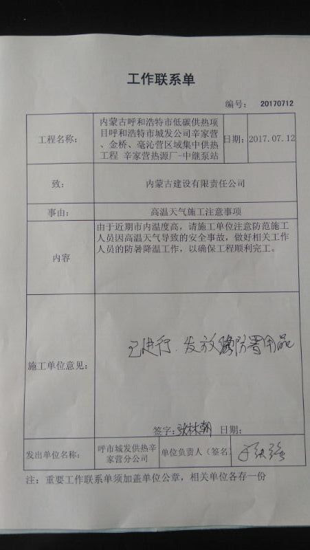 為此,工程自3月31日開工以來,全體參加建設(shè)的單位和個人,克服種種困難,加班加點,在保證安全和質(zhì)量的前提下,為確保今冬按時投運而努力施工;尤其是近日持續(xù)高溫以來,為既能確保施工人員的安全,又能確保工期不后延,施工方采取了早上工,晚收工,午增加休息時間,給施工人員熬制防暑綠豆湯等辦法,從而保證了施工有效時間,確保工期沒有任何延誤。同時,我分公司為保證暑期施工人員安全,及時給施工單位下發(fā)了《工作聯(lián)系單》,對高溫天氣施工提出要求,并要求施工單位有具體防暑措施。