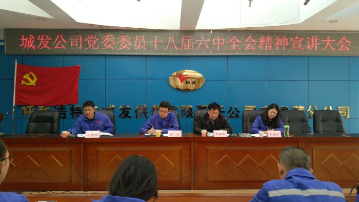 11月24日,城發(fā)公司黨委委員、公司常務(wù)副總經(jīng)理史繼文在三合村供熱分公司進(jìn)行了貫徹黨的十八屆六中全會(huì)精神宣講報(bào)告會(huì)。三合村供熱分公司黨支部書(shū)記楊保國(guó)、經(jīng)理張學(xué)文、副經(jīng)理娜仁、鄭凱、王俊平及全體黨員參加了此次報(bào)告會(huì)。
