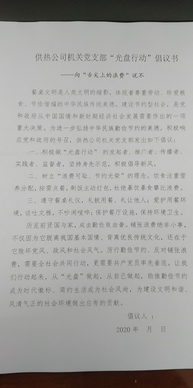 為了進(jìn)一步弘揚中華民族勤儉節(jié)約的美德,積極響應(yīng)黨和政府的號召。9月9日上午開始,城發(fā)供熱公司機關(guān)黨支部黨員、發(fā)展對象、積極分子共40人陸續(xù)簽署“光盤行動”倡議書。
