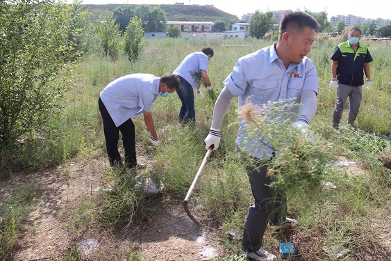 活動現(xiàn)場,黨支部書記娜仁、經(jīng)理史濤帶領大家在各自的責任區(qū)域內分片作業(yè)。大家在炎炎烈日下,揮汗如雨、干勁十足,有的拔除蒿草、有的收集清運……經(jīng)過一下午地辛勤作業(yè),小區(qū)及周邊的蒿草不見了,空氣清新了,環(huán)境也變美了。